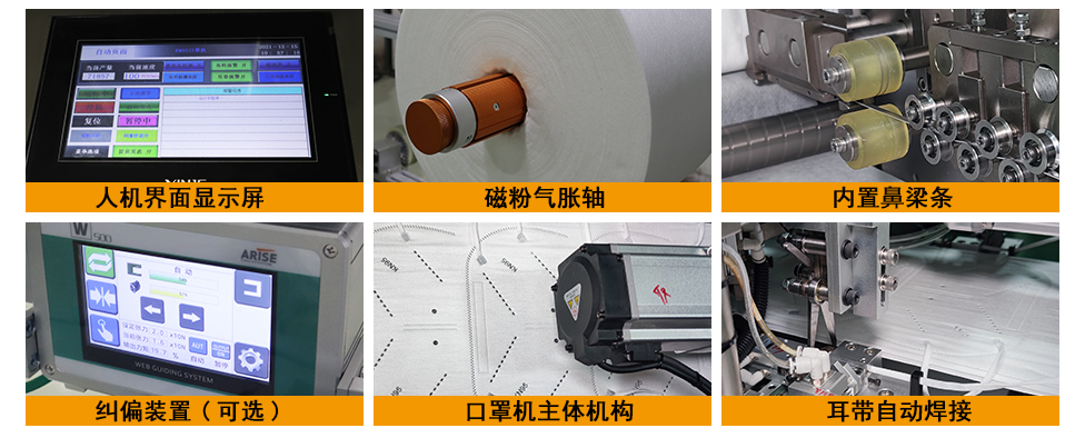 可根據(jù)生產(chǎn)工藝及市場需求自由選配生產(chǎn)3到6層KN95口罩。從 無紡布 ?口罩成型 ?口罩切斷分離 ? 口罩耳帶焊接? 全自動完成。個(gè)性化人機(jī)界面,參數(shù)化速度控制,一鍵提速化繁為簡,操作簡單。